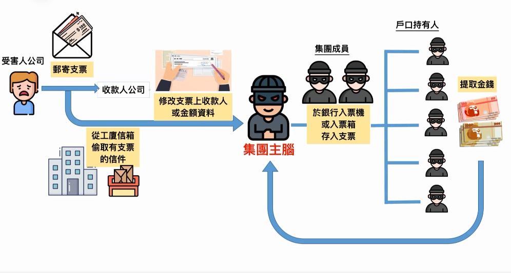 警方搗破一個盜取及刻意塗改支票的犯罪集團,拘捕包括主腦在內的8名男女,涉嫌在工廠大廈信箱偷取支票後,以電腦塗改收款人姓名和金額,涉案約130萬元。