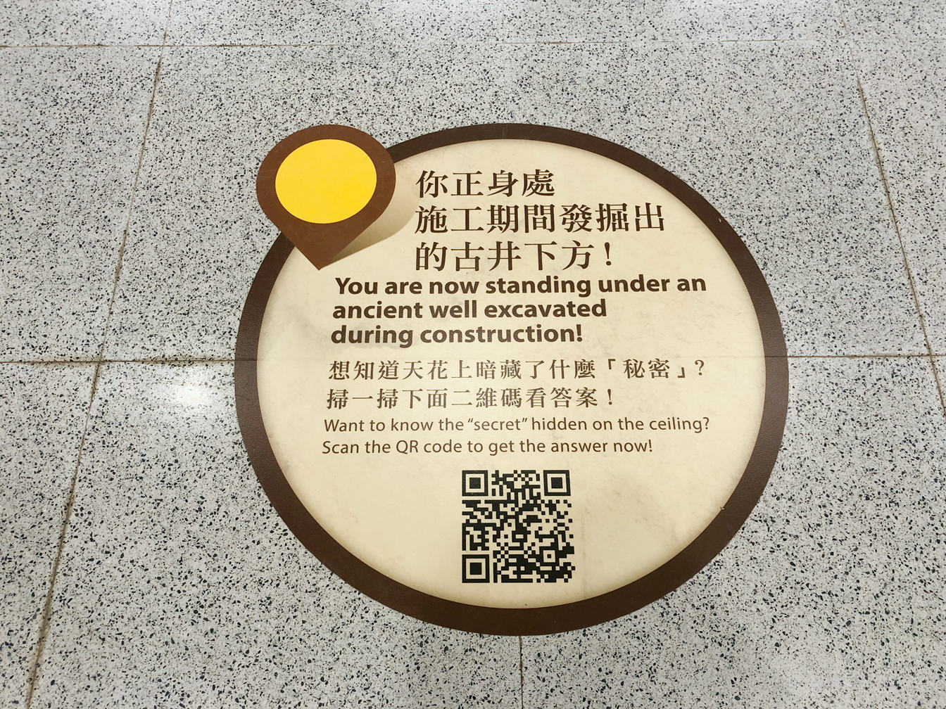 車站大堂設有展櫃以展示該區出土文物,港鐵公司正與古物古蹟辦事處商討有關展出安排。為預留彈性處理一個宋元時代古井及接連的引水槽日後在車站上方的原址重置安排,車站大堂的頂蓋設計已修改並加建混凝土井槽。混凝土底板日後可更換為透明底板,以便乘客在車站大堂仰望觀賞古井之底部。
