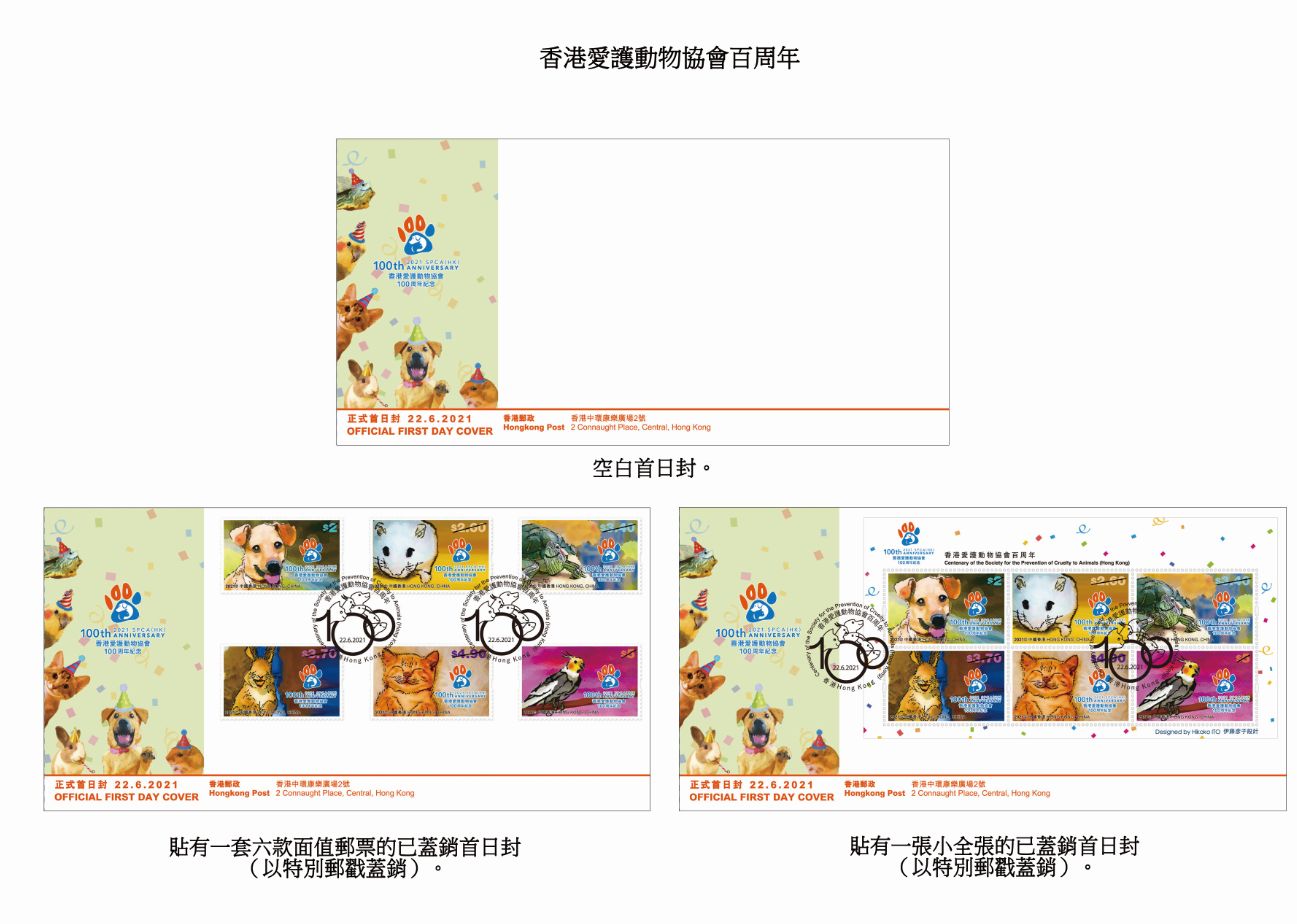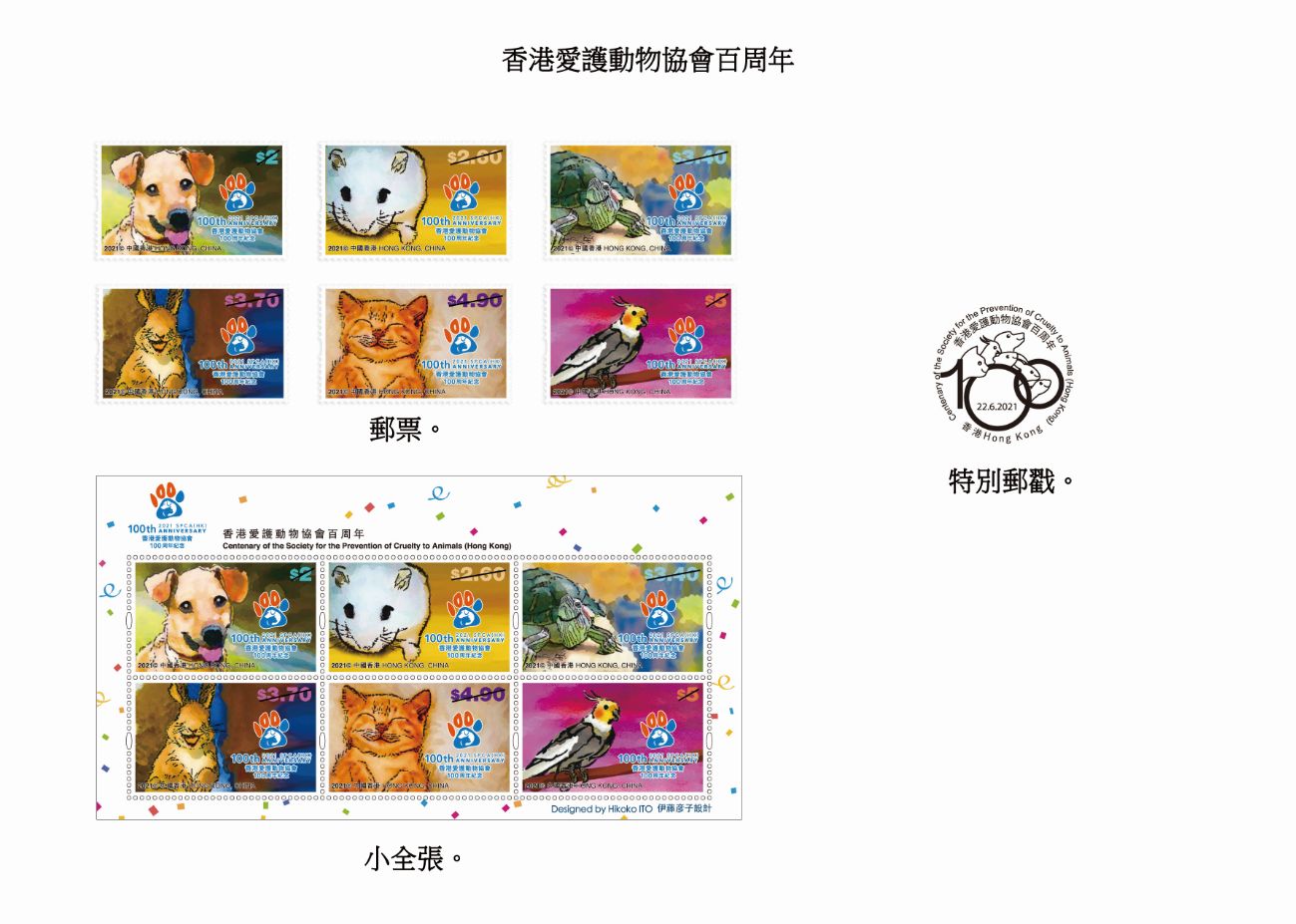 圖片說明:香港郵政在22日發行以「香港愛護動物協會百周年」為題的紀念郵票及相關集郵品;圖為郵票、小全張和特別郵戳。
