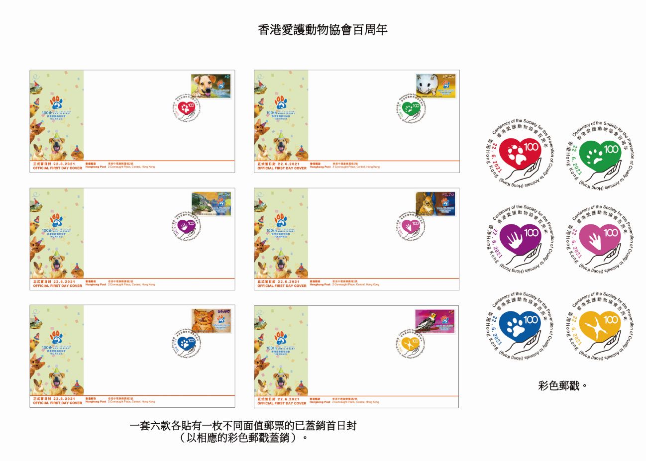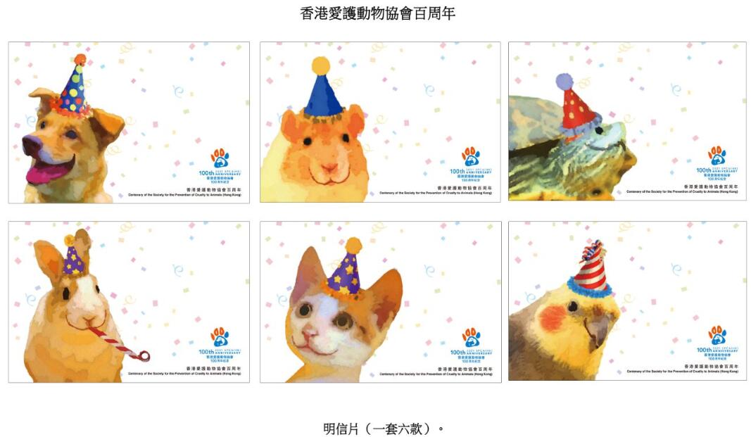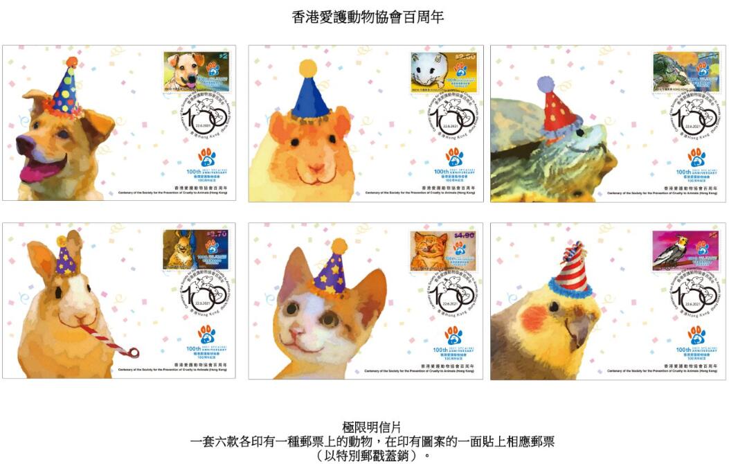 據了解,1套「香港愛護動物協會百周年」紀念郵票有6枚紀念郵票,它選用油畫風格,展現出愛協百周年誌慶的歡欣氣氛;郵票上分別繪有唐狗、倉鼠、紅耳龜、兔子、短毛家貓及雞尾鸚鵡6種動物,各自傳達不同訊息。