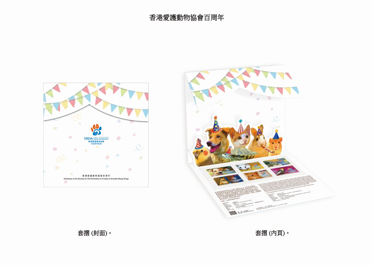 香港郵政認為套摺是最引人注目郵品,其封面印有色彩繽紛的彩帶及旗幟,內頁則有立體動物插畫;動物戴上可愛生日帽祝賀愛協百周年誌慶,至於6款彩色郵戳分別取材6種動物掌印、特別郵戳則利用簡約線條勾畫6種動物外型;彩色郵戳僅用於一套6款已蓋銷首日封及極限明信片上。