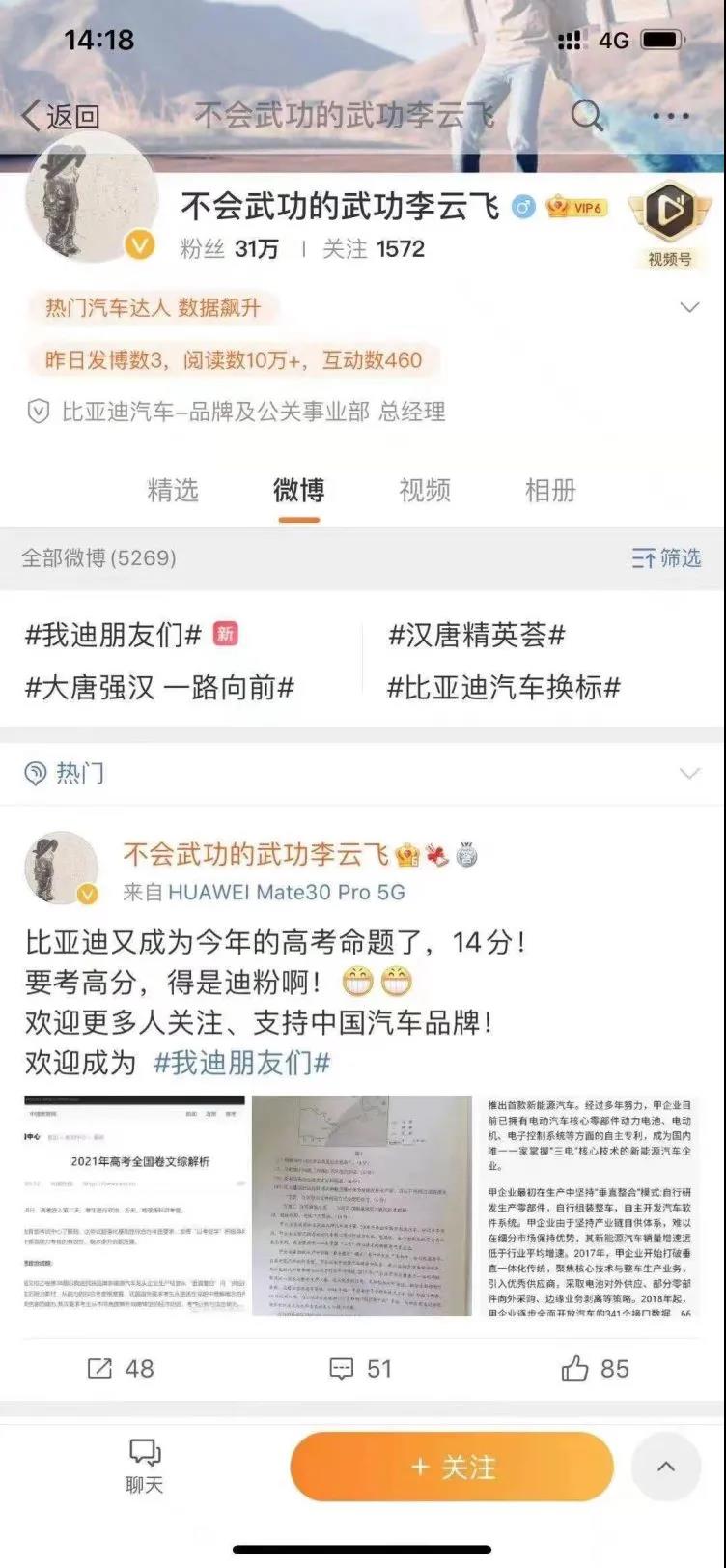 比亞迪品牌及公關事業部總經理李雲飛證實了這一點,並在其微博上發言稱:「比亞迪又成為今年的高考命題了!14分!要考高分,得是迪粉啊!」