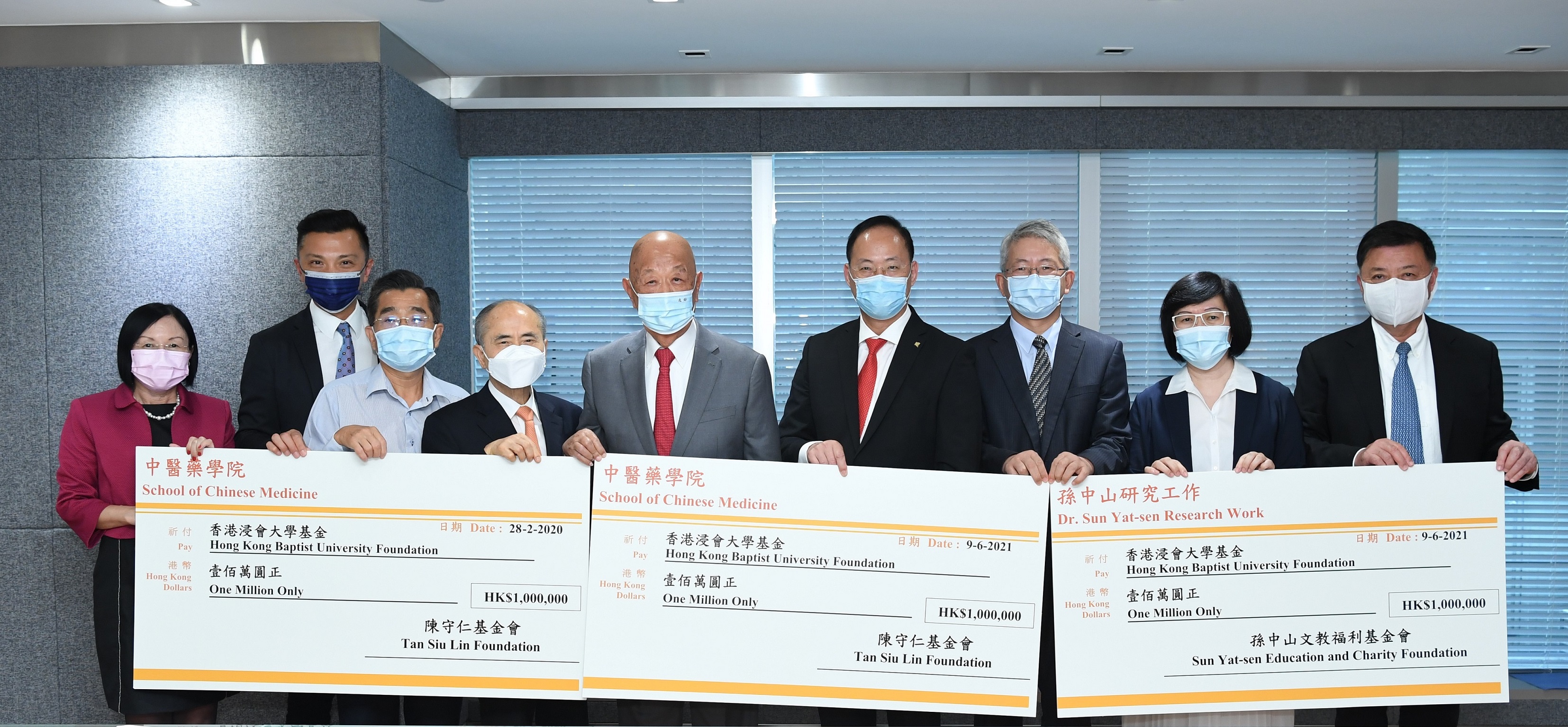 香港浸會大學獲陳守仁捐贈300萬元,當中包括陳守仁基金會於2020及2021年捐贈200萬元支持大學中醫藥學院發展和孫中山文教福利基金會今年捐贈100萬元支持大學歷史系推展「孫中山研究工作」。