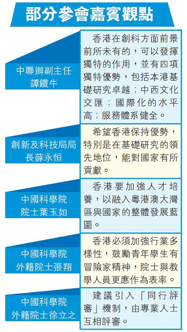 會上,創新及科技局局長薛永恒表示,當前是香港的黃金機遇,而國家要實現科技自立自強,香港有一定的重要角色,比如在航天技術中「天問一號」「嫦娥五號」就有香港院校的科研成果參與。他希望香港保持優勢,特別是在基礎研究的領先地位,香港能對國家有所貢獻。他亦指,國家相當重視香港科技的研究成果,希望大學能進一步加強技術研究,有更多的成果產生,能有效推動科技行業發展,進一步融合到國家的發展大局。他提到,香港科研發展的前提是社會穩定,完善選舉制度是必要的改革。