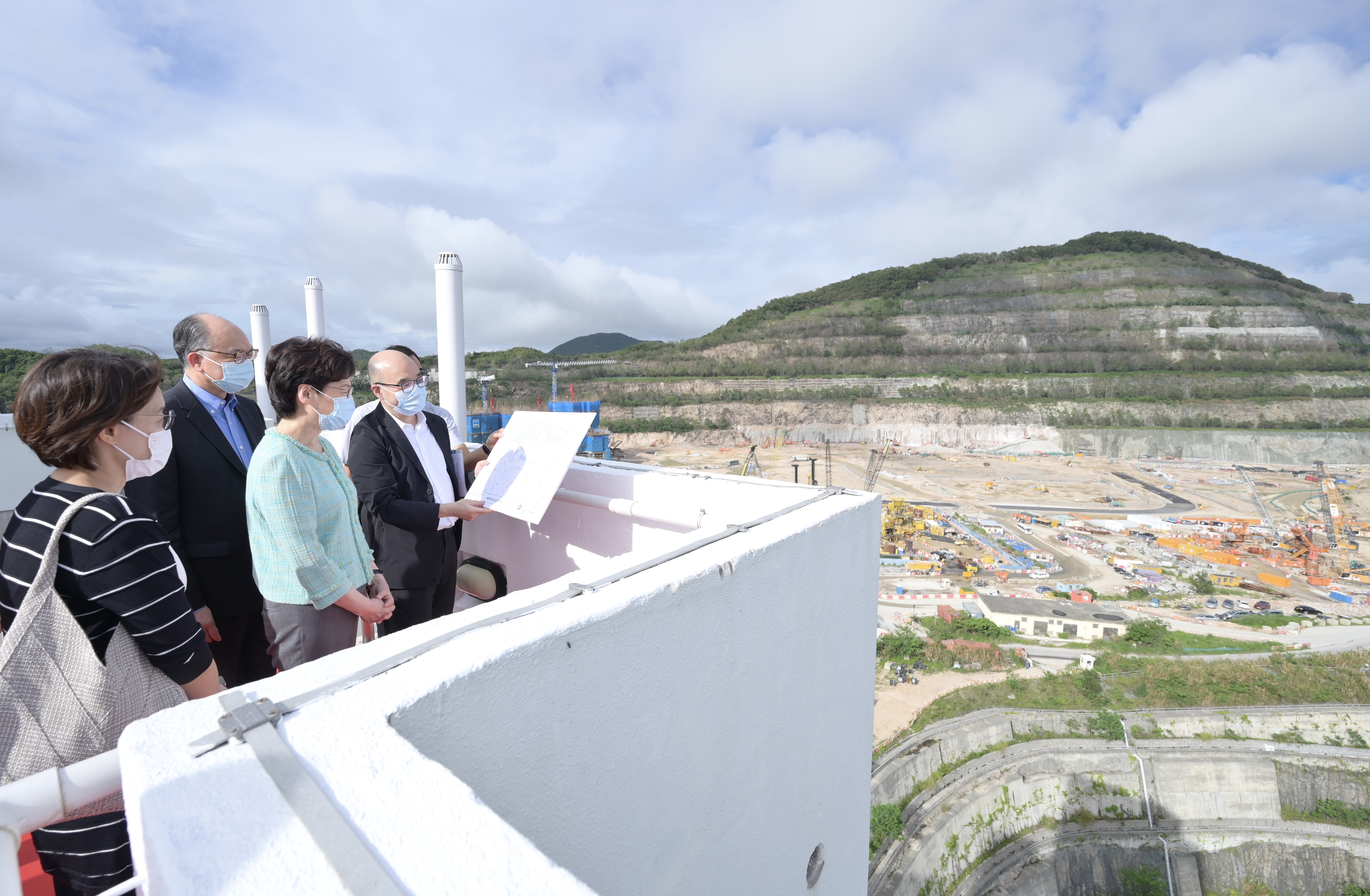 林鄭月娥在陳帆陪同下,參觀位處前安達臣道石礦場的觀塘安秀道安泰邨。林鄭月娥在天台聽取房屋署人員介紹該片用地各項發展計劃的進度。