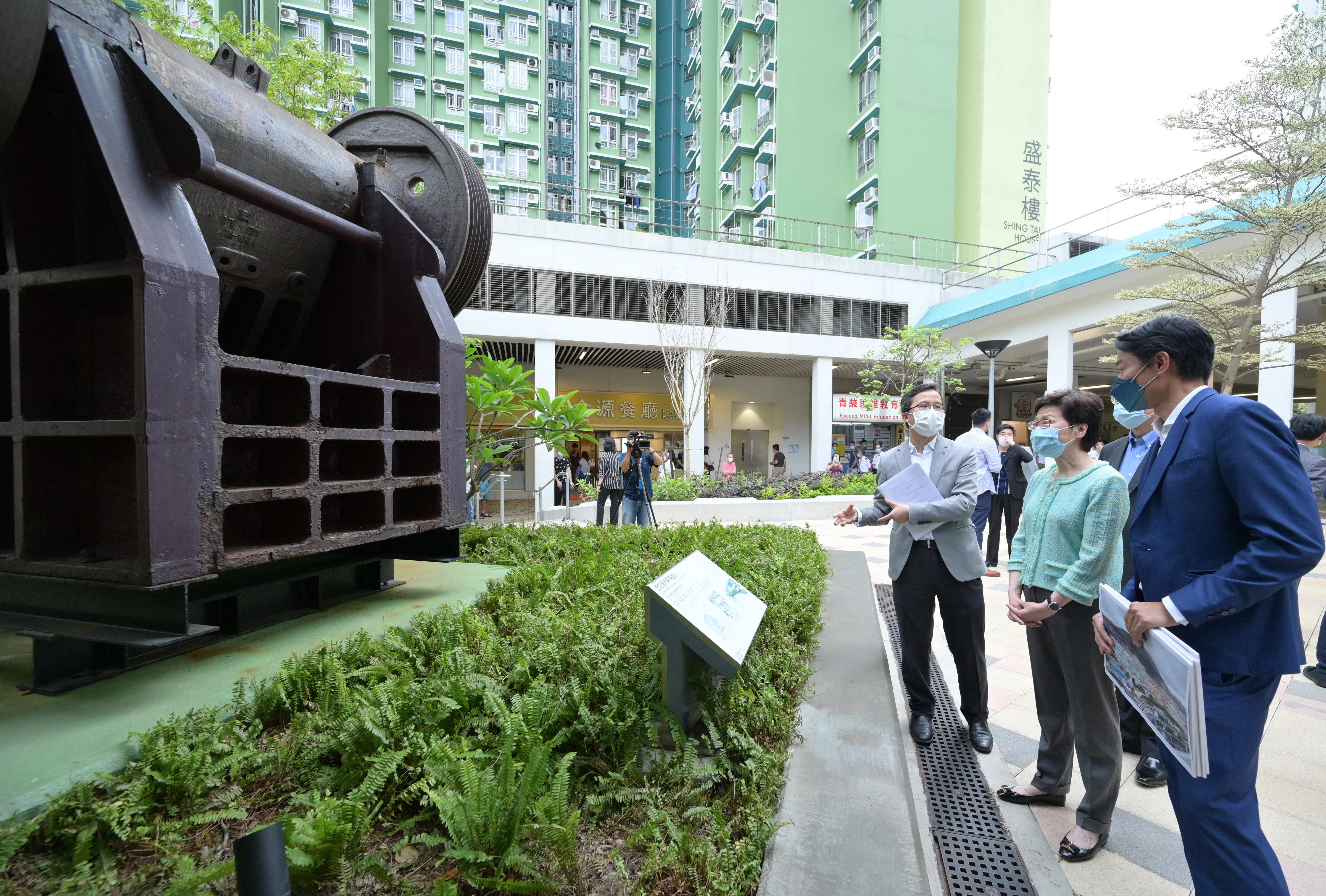 林鄭月娥聽取房屋署人員介紹取自安達臣道石礦場的機械工具配件的展示品