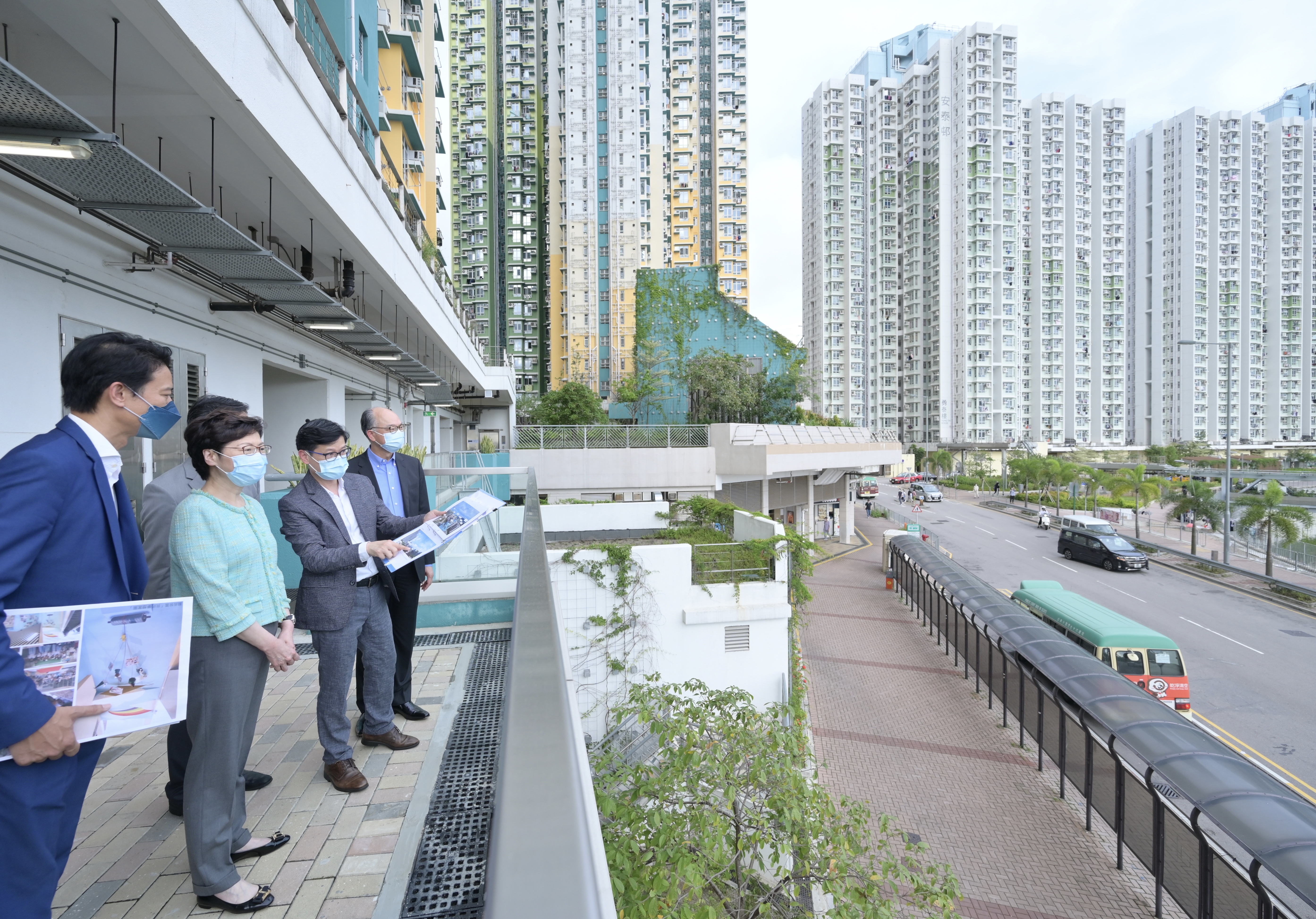 行政長官林鄭月娥今日(10日)參觀位處前安達臣道石礦場的觀塘安秀道安泰邨,了解房屋署近年興建公屋的環保考慮和該片用地各項發展計劃的進度,運輸及房屋局局長陳帆陪同。