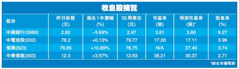 本地公用股中,投資者可關注中電(002)及煤氣(003)。當中,中電現價息率近4厘,雖然去年受疫情影響令收入減少,但集團營運盈利仍按年上升4.1%至115.8億元,全年派息增0.6%至3.1元。事實上,中電在過去10年的派息幾乎每年遞增,而且股價在過去10年也呈現明顯的上升趨勢,若10年前買入並持有至今(現價80元計),連股息在內的投資回報已超過210%。