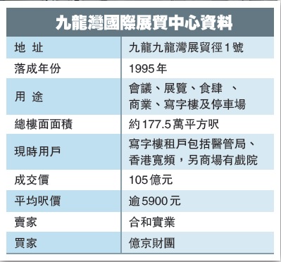 早前市傳獲億京領頭洽購合和實業旗下九龍灣國際展貿中心(簡稱九展),11日市場消息證實,買賣幾近落實,成交價105億元,料成今年最大宗的商廈易手個案。