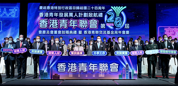 行政長官林鄭月娥六月十一日出席香港青年聯會第28屆會慶及會董會就職典禮。圖示(前排左起)全國人民代表大會常務委員會委員譚耀宗、立法會主席梁君彥、財政司司長陳茂波、中華人民共和國外交部駐香港特別行政區特派員公署副特派員楊義瑞、林鄭月娥、香港青年聯會主席樓家強、中央人民政府駐香港特別行政區聯絡辦公室副主任陳冬、政務司司長張建宗、中國人民解放軍駐香港部隊政治工作部副主任漆曉春和行政會議非官守議員召集人陳智思主持「香港青年發展萬人計劃啟航禮」儀式。