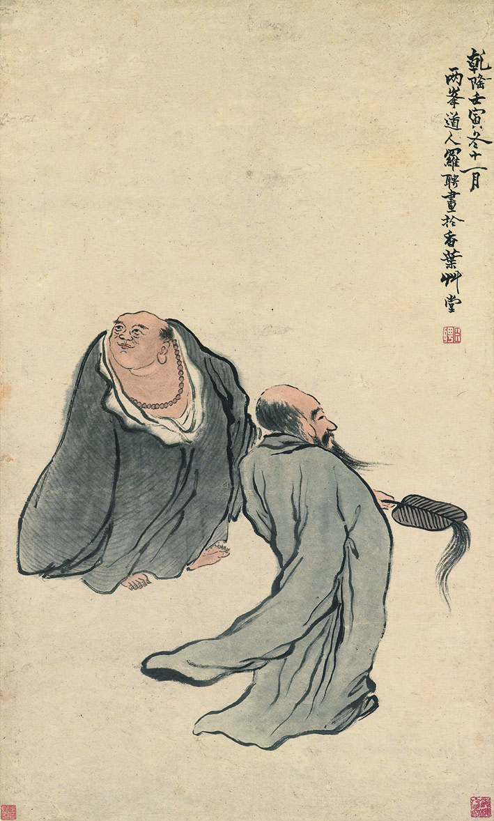 此《羅漢圖》作於1782年,正值作者羅聘繪畫風格的蛻變期,畫中繪寫一老一少兩個僧人,形態誇張,樣貌古樸,雖以逸筆草草寫成,卻法度嚴謹,形神俱足。畫面既不做背景鋪陳,也無過多筆墨陪襯,簡潔空靈,灑脫自然,頗具禪意。金農十分讚賞羅聘的人物畫,說道:「初仿江路野梅,繼又學予人物蕃馬、奇樹窠石,筆端聰明,無毫末之舛焉。」現代繪畫大師黃賓虹亦曾說:「羅兩峰之人物,綽有大家風度。」