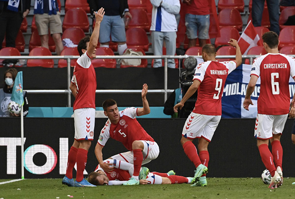 第42分鐘,丹麥當家球星埃里克森在非對抗情況下突然暈厥倒地,隊醫迅速進場處理,從比賽鏡頭來看,埃里克森已經完全失去意識,丹麥球員將埃里克森圍了起來,德萊尼甚至已經哭了,球迷也在現場濕潤了雙眼。隊醫依然在對埃里克森進行搶救。