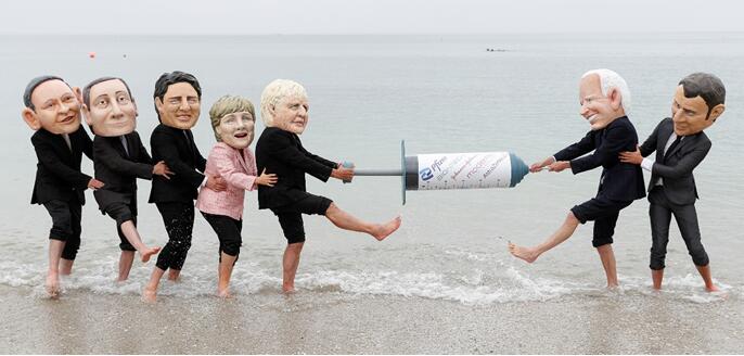 當地時間 6月11日,在英國康沃爾郡,樂施會活動人士帶上G7領導人樣子的頭套舉行抗議活動。樂施會是一個非政府組織,致力於推動民眾力量,以消除貧窮。
