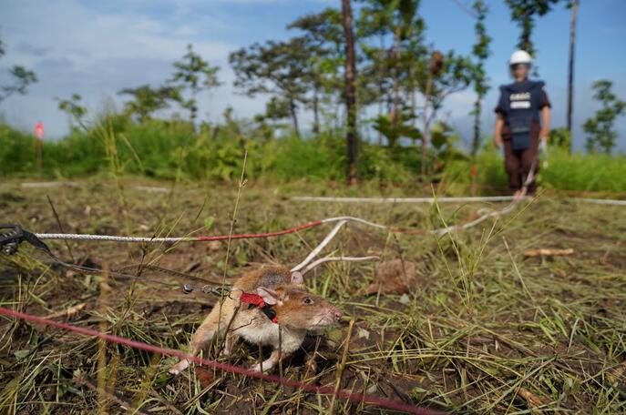 當地時間6月11日,在柬埔寨的柏威夏省,一隻掃雷鼠正在進行排雷工作。