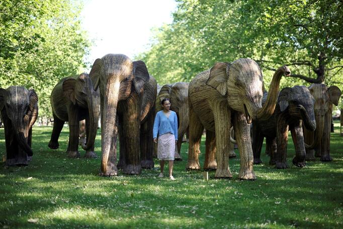 當地時間6月14日,在英國倫敦的綠園,人們在參觀園內的數尊 1:1大象雕塑。這些雕塑是「大象家族信託」特地為一個名為「共存」的活動而準備的展品。