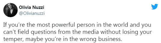 拜登的回答引發了一些記者的不滿。《紐約》雜誌的奧利維婭•努齊發推稱:「如果你是世界上最有權勢的人,但面對媒體的提問做不到不發脾氣,那也許是你入錯行了。」