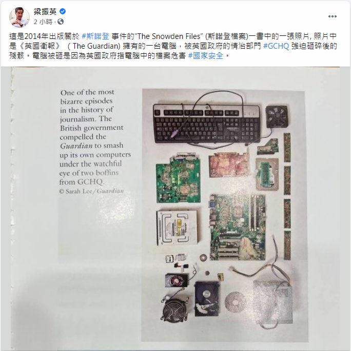 他舉例指,2019年,澳洲聯邦警察曾搜查澳洲廣播公司(ABC)。他在fb上載一張照片,是2014年出版的關於斯諾登事件的《斯諾登檔案》(The Snowden Files)一書中的一張照片,照片中是《英國衛報》(The Guardian) 擁有的一台電腦,被英國政府的情治部門(GCHQ)強迫砸碎後的殘骸,電腦被砸是因為英國政府指電腦中的檔案危害國家安全。