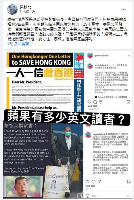 吳秋北續指,警方是次行動中有拘捕、有搜查新聞材料,也有凍結資產,與過去做法明顯不同,反映案件嚴重性。他認為,2019年的黑暴期間,《蘋果日報》在實體報章及網上有數十篇中英文報道,呼籲外國制裁國家及香港政府,有證據表明是向境外機構提供口實進行制裁,所以他希望警方徹查,要向公眾披露《蘋果日報》在事件中的角色。