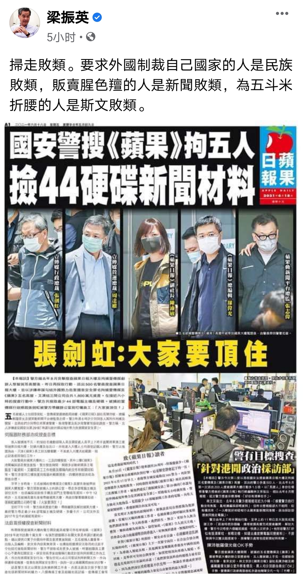 全國政協副主席梁振英今天(18日)在社交媒體發文痛斥蘋果日報,指要求外國制裁自己國家的人是民族敗類。