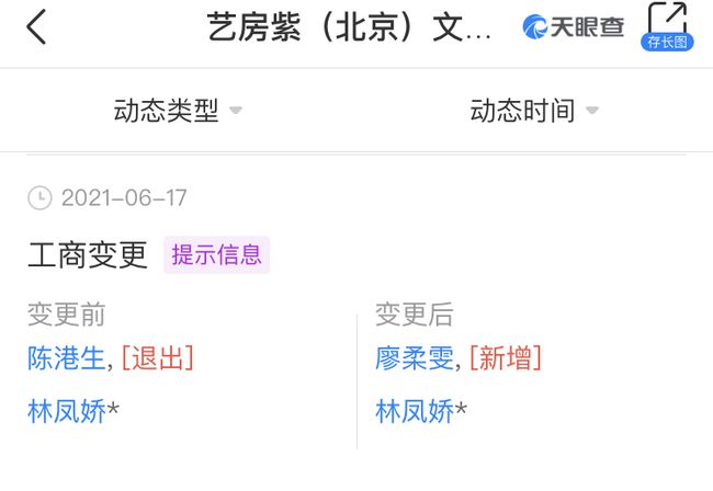 天眼查App顯示,近日,北京中泰龍威房地產諮詢有限公司、藝房紫(北京)文化傳播有限公司接連發生工商變更,陳港生(成龍)退出,新增廖柔雯;兩家公司均成立於2007年2月。