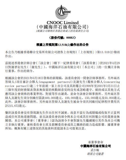 中海油:謝孝衍遭香港會計師公會譴責不影響履行職務