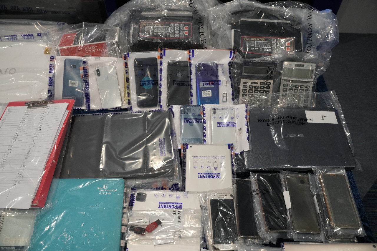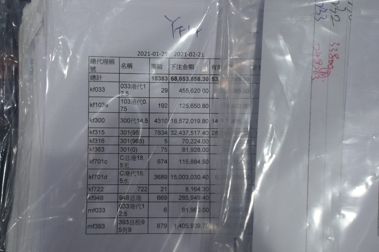 許康傑指出,各人被捕後由探員押解到寓所內搜查,檢獲約850萬元現金,同時扣押4輛疑犯名下的名貴房車,相信均為犯罪所得。許又稱,相信集團主腦由3名助手協助營運,負責收受投注、會計及收取賭款,該3名助手招攬大批俗稱「艇仔」的拆家,替賭客進行賽馬和足球投注,均利用電話或社交媒體即時通訊程式交易。因賭注以現金交收,警方調查期間發現有疑犯親友的銀行戶口疑被用作洗黑錢,凍結共1950萬元存款。