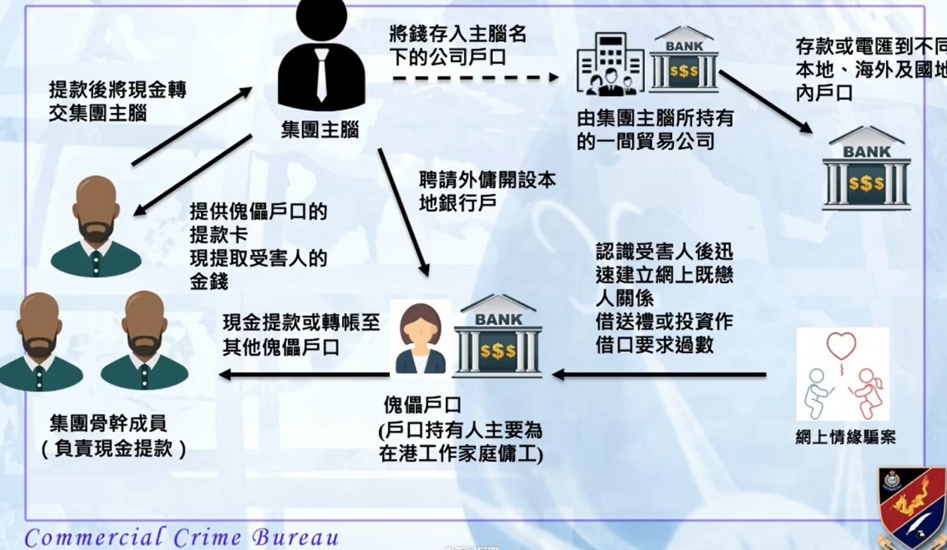 警方在本年3月開始發現多名外傭開設銀行戶口涉及網上情緣騙案,相信由一個非華裔人士的犯罪集團操控外傭開戶口收取犯罪得益。在本月16日和17日共拘捕14人,包括一名主腦、3名骨幹成員和10名戶口持有人,檢獲150萬元現金。涉嫌在2020年12月至今以21個傀儡戶口清洗1200萬元,涉及30宗網上情緣案。