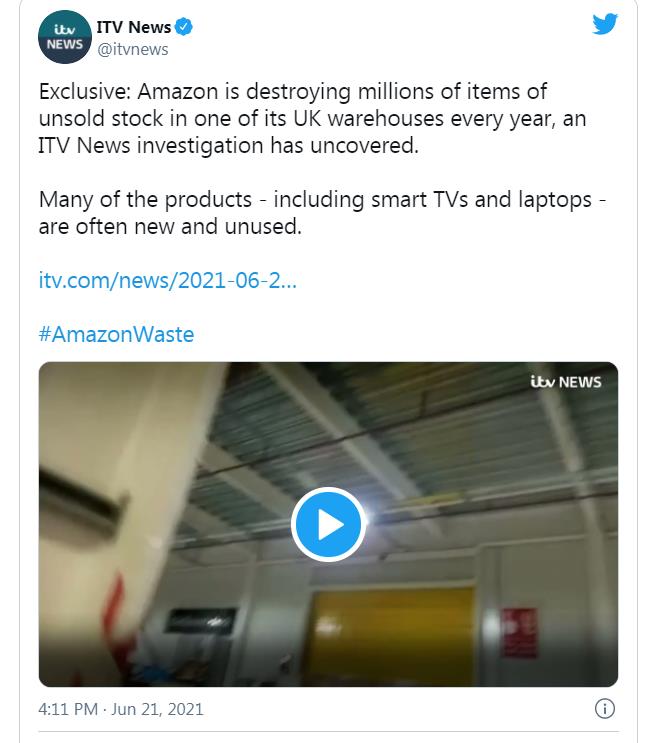 ITV在蘇格蘭鄧弗姆林的亞馬遜倉庫內拍攝了臥底鏡頭。視頻顯示,筆記本電腦、電視、珠寶、耳機、書籍和口罩被裝入標有「銷毀」字樣的板條箱。