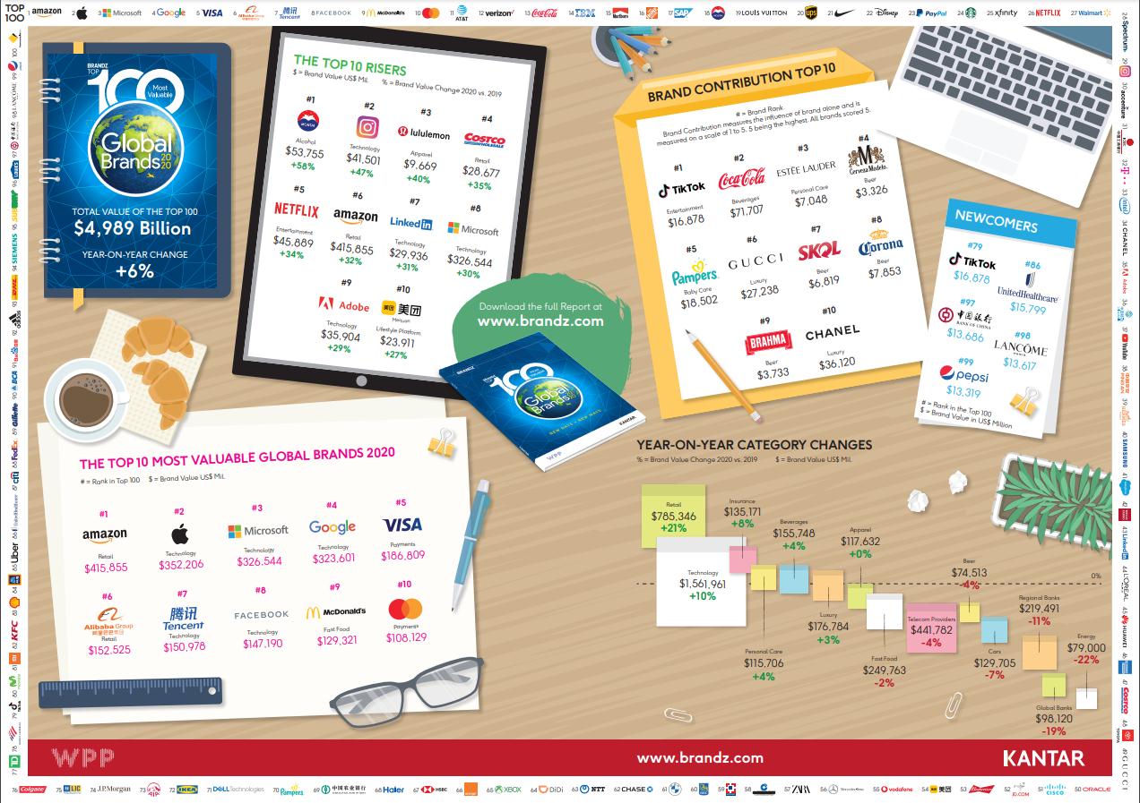 Kantar BrandZ公布全球前100大最具價值的品牌企業,前三名分別由亞馬遜、蘋果和谷歌所榮獲。中國方面,騰訊和阿里巴巴集團也躋身前十名,分別奪得第5名和第7名。今年百大品牌市值為7.1萬億美元,比去年5萬億美元大幅成長。