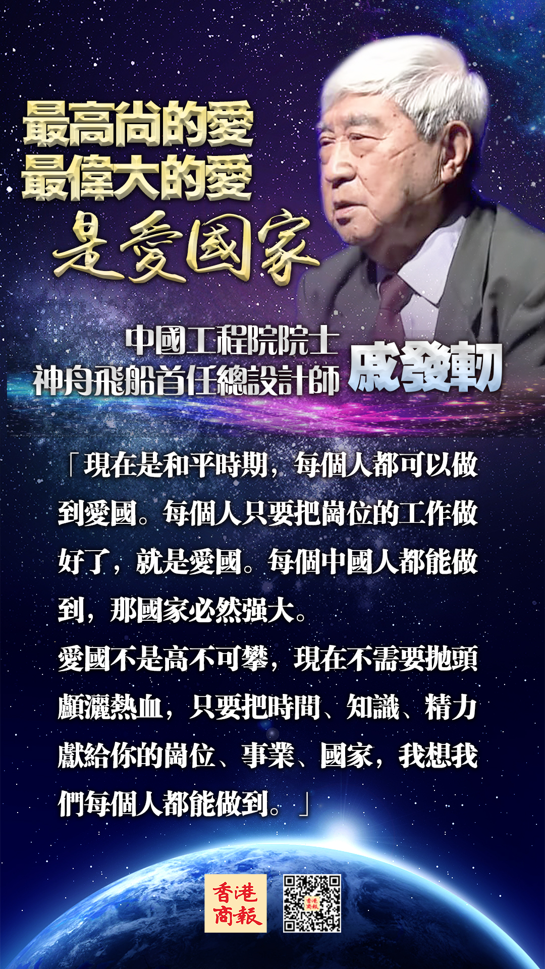 中國工程院院士、神舟飛船首任總設計師戚發軔今天(23日)於香港理工大學作《中國航天與航天精神》講座。戚發軔在講座上談及愛國精神,回顧自己成長經歷,指出愛國精神重要性,並提出每個人只要把崗位工作做好,就是愛國。他的這番講話迎來現場熱烈的掌聲。