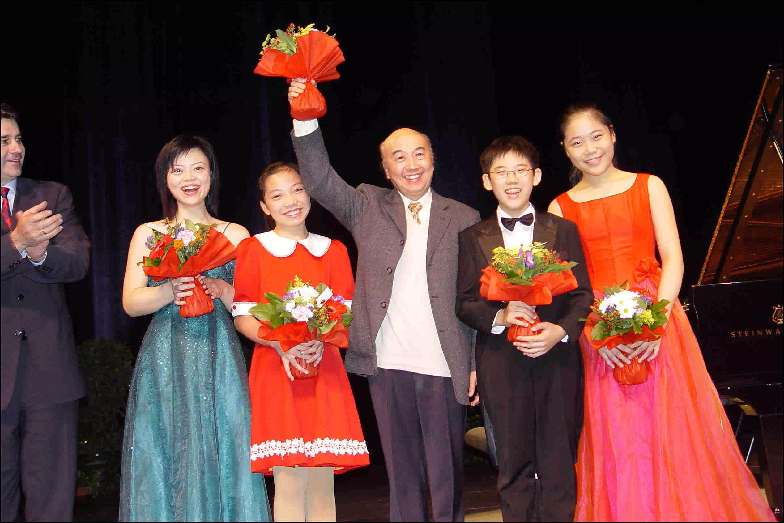 但昭義(右三)被稱為鋼琴界的「金牌教練」,桃李滿天下,教出多名得獎鋼琴家,其中一名是左章(右一)。