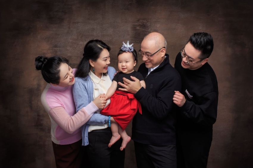 左章(左一)於去年1月誕下女兒,一家人樂也融融。