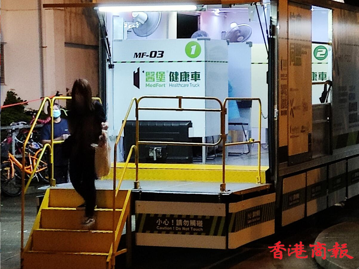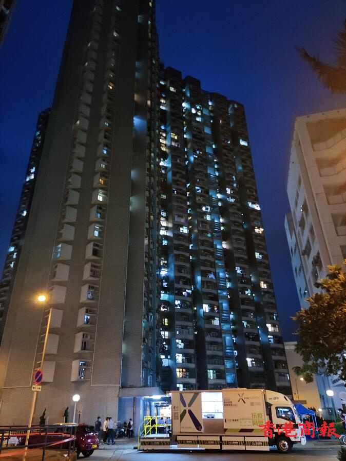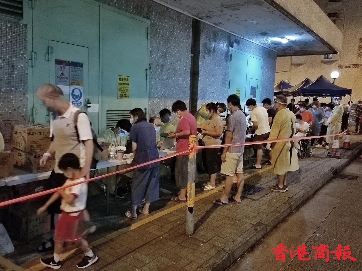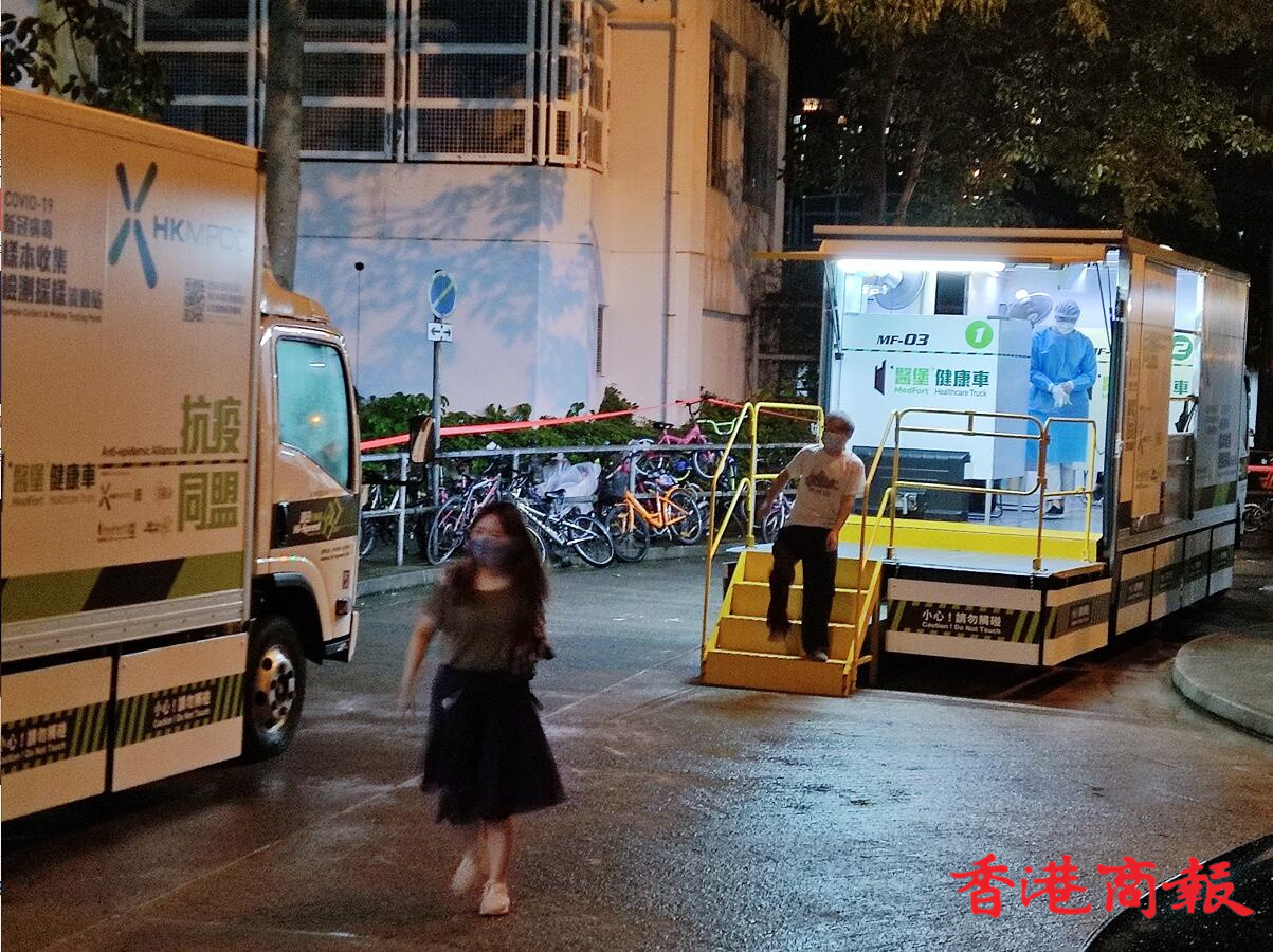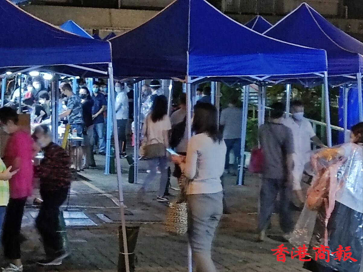 政府在逸雅苑A座(逸榮閣)對出空地有流動採樣站,大批市民到來進行檢測。(馮瀚文攝)