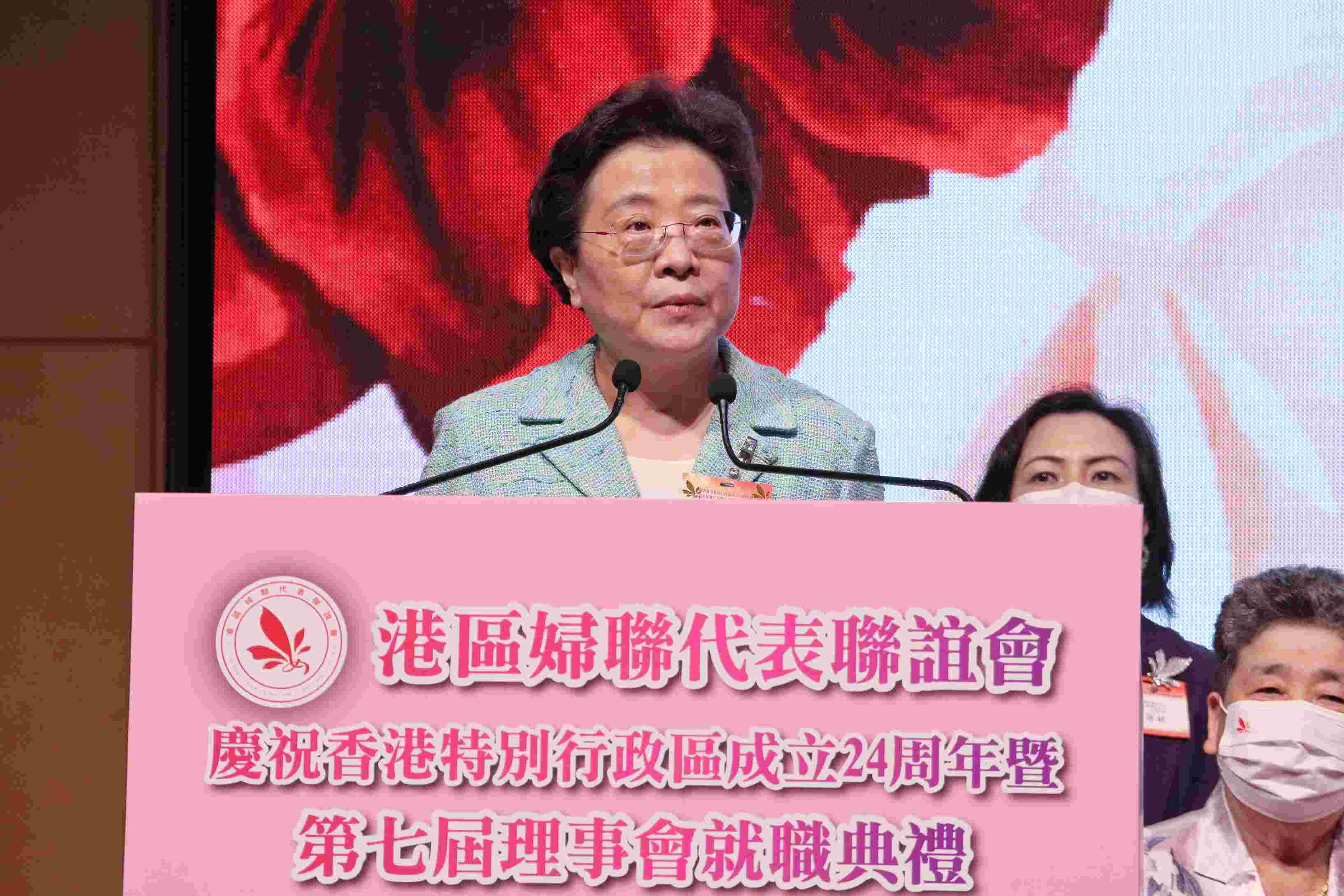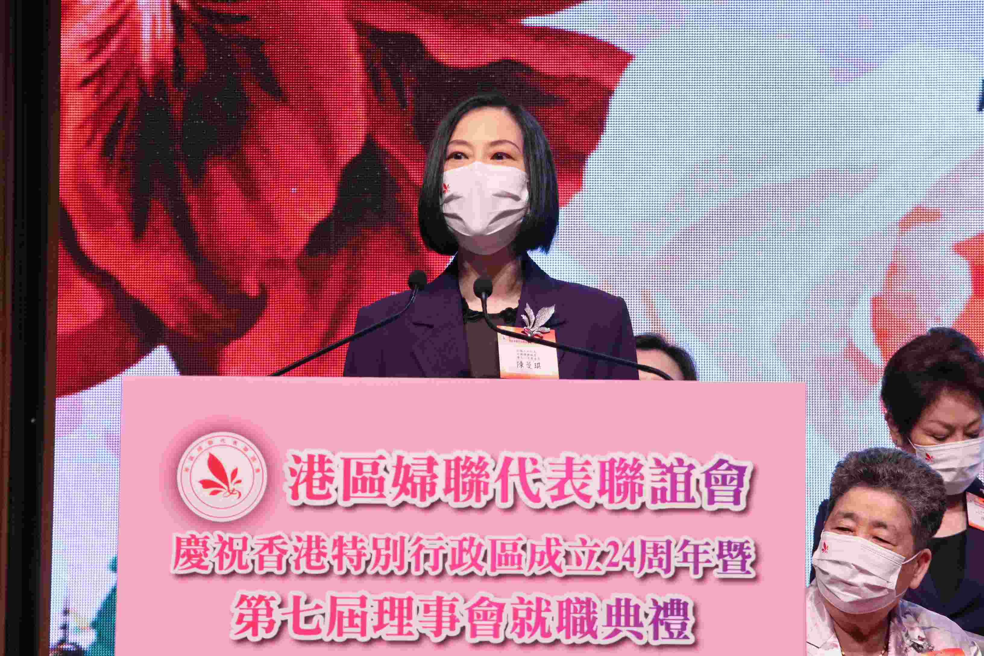 林鄭月娥致辭時說,港區婦聯匯聚了香港各界的女性精英,積極倡導性別平等,維護婦女兒童權益,關注弱勢社群,促進社會和諧,並致力加強與內地婦聯的交流溝通與合作。她肯定了該會支持特區政府依法施政所作出的貢獻。她指出,過去一年,全國人大先後制定了香港國安法,又完善了特區選舉制度。落實過程中,該會成員積極發聲,舉辦專題講座,向社會普及新規,增進了社會了解和認同。