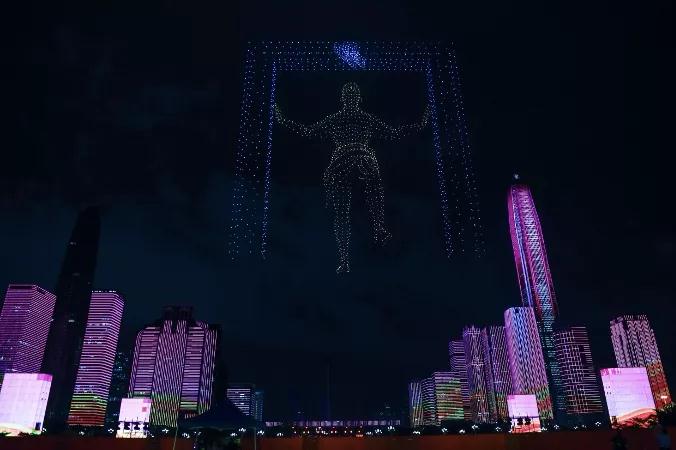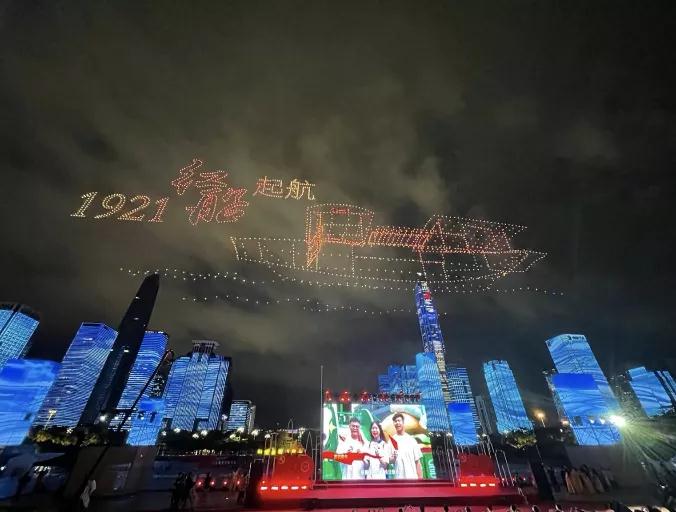 台上台下的互動將現場氣氛推向高潮,活動進入到最激動人心的部分,啟航征程的南湖紅船、雄偉莊嚴的天安門、敢闖敢試的拓荒牛、白紙上擘劃壯美藍圖的前海……在深圳CBD絢爛燈光秀的上空,2021架無人機在天空飛舞,描繪出一個個中華民族不甘落後、拼搏奮鬥的歷史畫面。