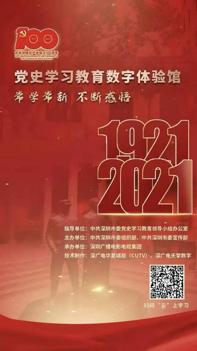 在中共深圳市委黨史學習教育領導小組辦公室指導下,由市委組織部、市委宣傳部會同深圳廣電集團共同打造「黨史學習教育雲平台」正式上線,平台運用8K、5G、AI、VR等前沿技術,將中共寶安縣第一次黨員代表大會舊址、山廈革命歷史紀念館、中國文化名人大營救紀念館、土洋東江縱隊司令部舊址、「深圳市羅湖區漁民村村史」展覽和「從先行先試到先行示範——慶祝深圳經濟特區建立四十周年展覽」6個紅色教育基地搬到線上,採取三維模型製作和虛擬仿真、實時渲染的形式,1:1超高清地還原實體展館所有的細節,讓展板上的黨史資料、陳列櫃裏的文物都「活」起來。在數字體驗館中,黨員群眾通過一鍵漫遊、自由探索、互動聽講解等方式,在生動的歷史故事下、復原的歷史場景中身臨其境地感受建黨百年的艱辛歷程、巨大變化、輝煌成就,帶來黨史學習教育的全新沉浸式體驗。