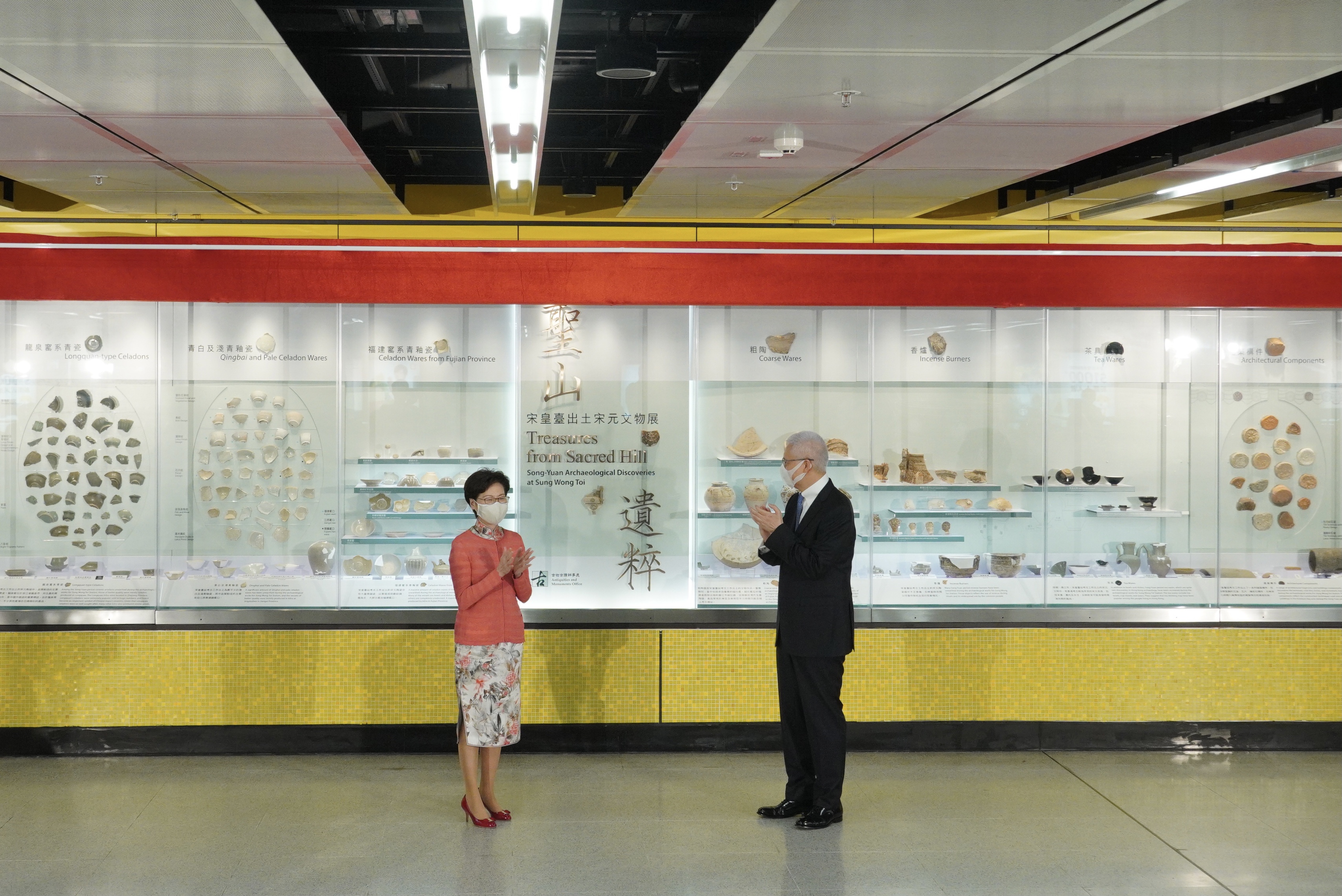 林鄭續指,屯馬線其中一項挑戰是文物保育,宋皇臺站附近的帝皇歷史由來已久,建造期間的考古工作更發現大量文物及遺跡,政府其後宣布原址保留大部分重要遺跡,港鐵亦修改車站設計,結合考古元素,並在車站大堂加設展櫃,有超過400件出土文物,車站大堂天花會預留位置,重置重建古井。