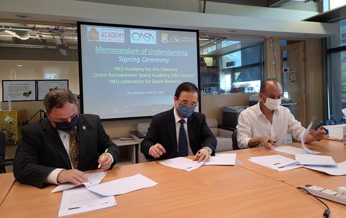 香港大學太空研究實驗室總監Quentin Parker,港大收生及國際生交流事務總監嚴志堅和創星滙(香港)有限公司主席李嘉樂在5月27日簽署合作備忘錄。