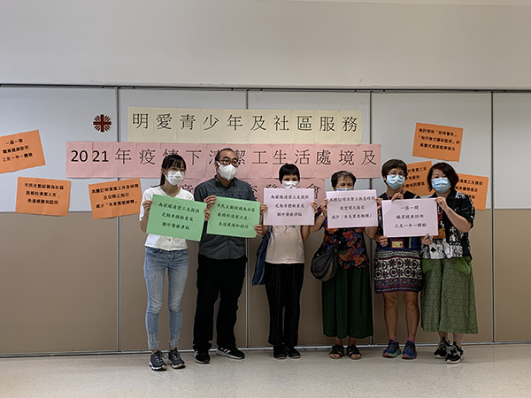 明愛青少年及社區服務提出4項建議,分別是政府可重推「防疫抗疫基金」每月1次的「辛勞津貼」直至新冠肺炎疫情結束、具體訂明清潔工休息時間和空間之指引、檢討現時「即時警告」的監察方式,減緩工人不安感以及檢討現時社區垃圾處理制度,引入有效垃圾和廚餘處理程序,讓居民及工友容易配合。
