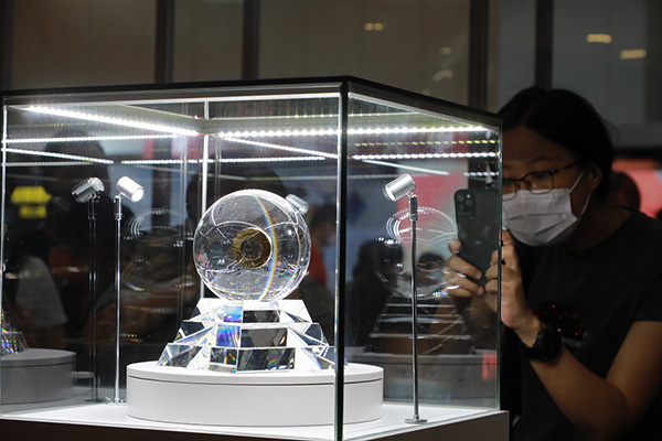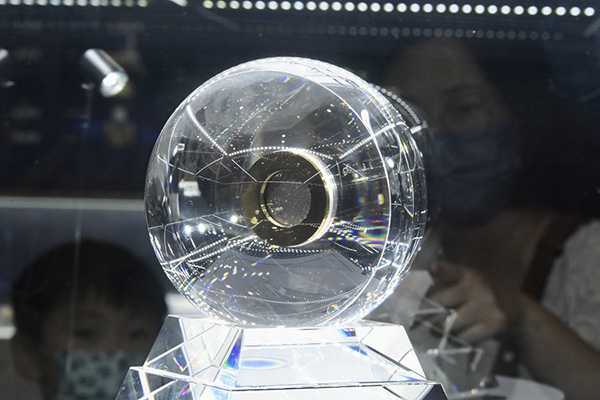 備受關注的月壤樣品被放在玻璃展示台上,密封存置於一個透明的「水晶球」中,在燈光照耀下,放在棱台裝置上的月壤低速旋轉著,流光溢彩。近距離可以看到,月壤顆粒的質地極細,非常乾燥。據介紹,其主要由氧、鋁、鐵、矽、鎂、鈣、鈉等元素組成,不含任何有機物質。