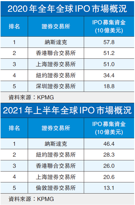 畢馬威28日發布《內地及香港IPO市場2021年中期回顧》報告。綜觀全球市場,2021年上半年的集資總額和上市宗數較去年同期分別上升196%及134%。港交所集資額達2132億港元,創港股市場歷史新高。該行預計,下半年中概股來港趨勢將繼續保持,本港全年集資額應不少於4000億港元。