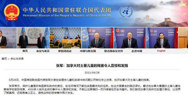 張軍對近期加拿大原住民寄宿學校舊址發現兒童遺骸的事件表示關切。他指出,保護兒童是所有國家和政府的責任,在任何情況下都應該是最優先的任務。在這方面要走的路還很長。最近在加拿大暴露的土著兒童在寄宿學校受到殘害,4000多人喪失生命的事件令人震驚和發指。不能讓這黑暗的一頁只停留在歷史書籍中。我們敦促加拿大政府切實履行責任,讓世界了解真相,還受害者以正義,避免這樣的悲慘事件再次發生。