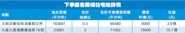 黃偉綸指出,下季將推出兩幅住宅地,合共涉及200伙,較上一季度的980伙,按季跌80%。兩幅地皮分別為九龍塘廣播道79號及元朗流業街與涌業路交界。