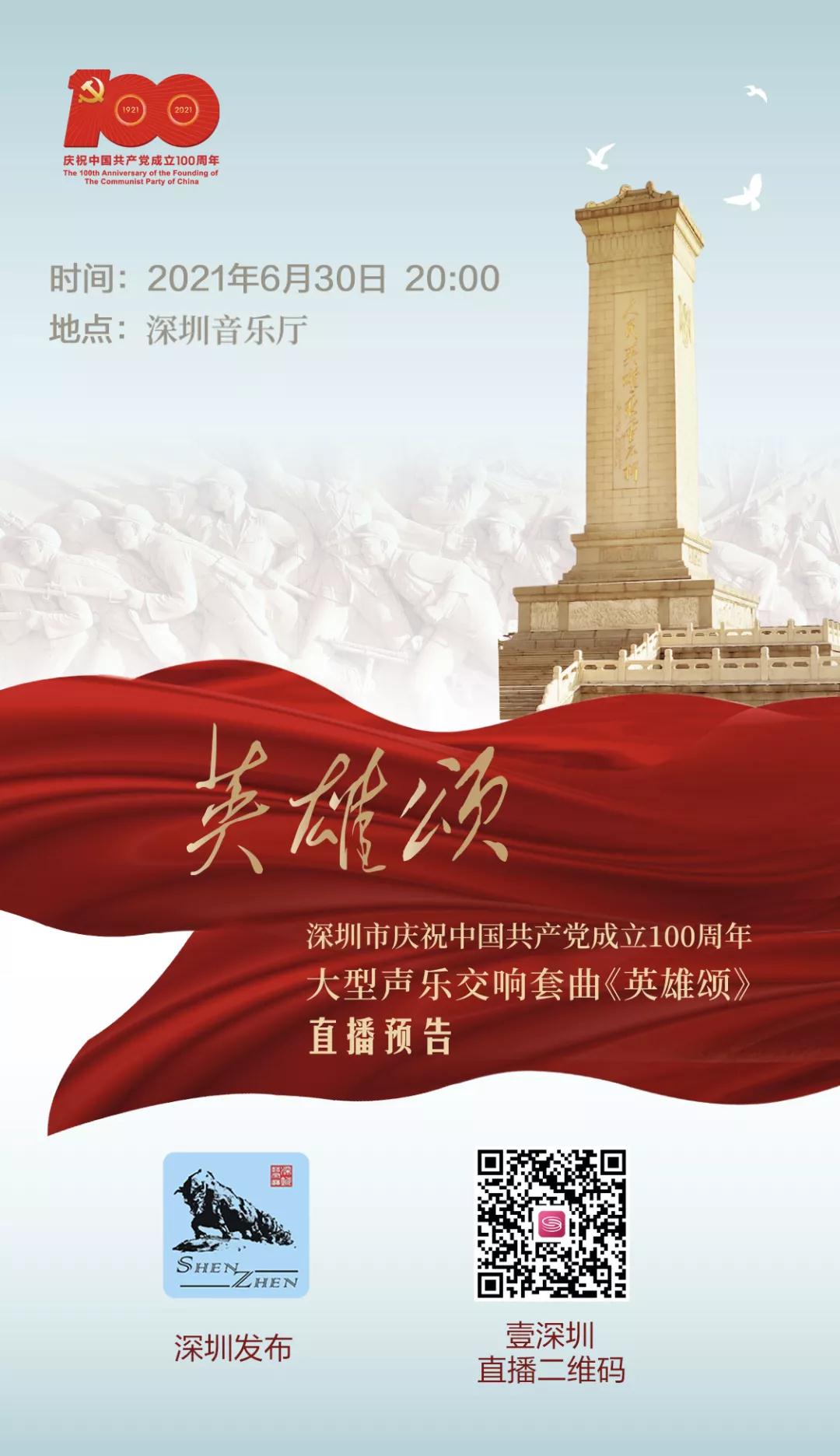 為慶祝中國共產黨成立100周年,根據深圳市關於建黨百年的總體活動安排,大型聲樂交響套曲《英雄頌》音樂會定於6月30日20:00在深圳音樂廳首演。