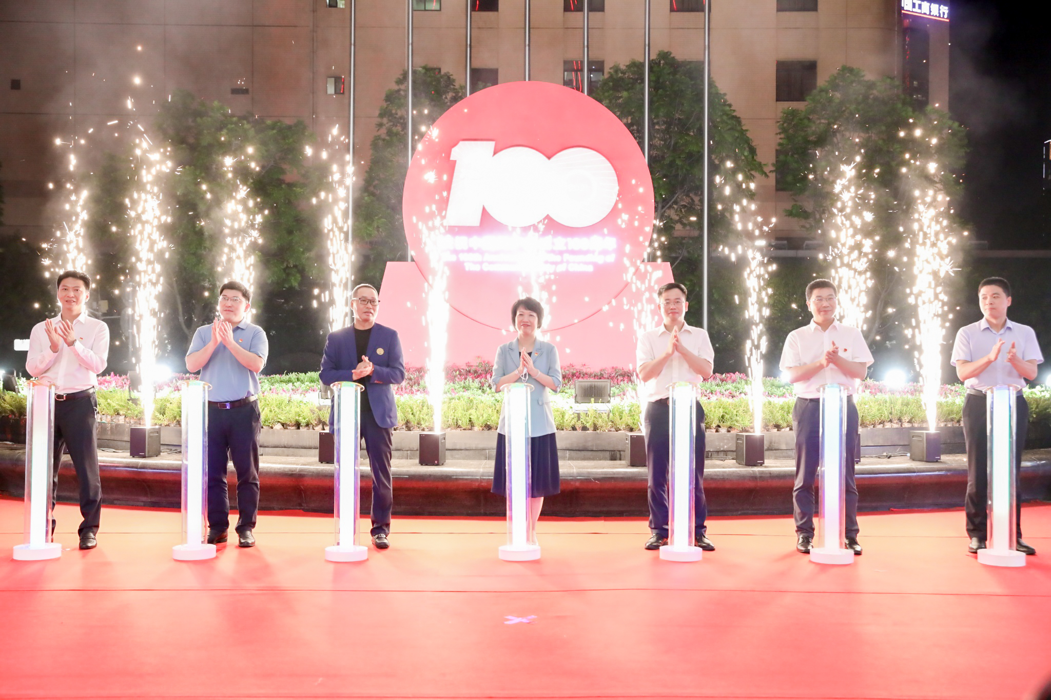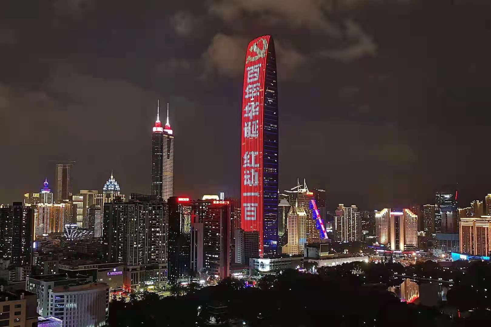 隨着參會領導和嘉賓按下儀式啟動鍵,羅湖地標建築京基100被「點亮」,滾動顯示「百年華誕 紅動一百」「崢嶸歲月 百年風華」祝福語,噴泉廣場亮如白晝,映入觀眾眼中,現場發出陣陣讚嘆聲,將慶祝的氛圍推向高潮。
