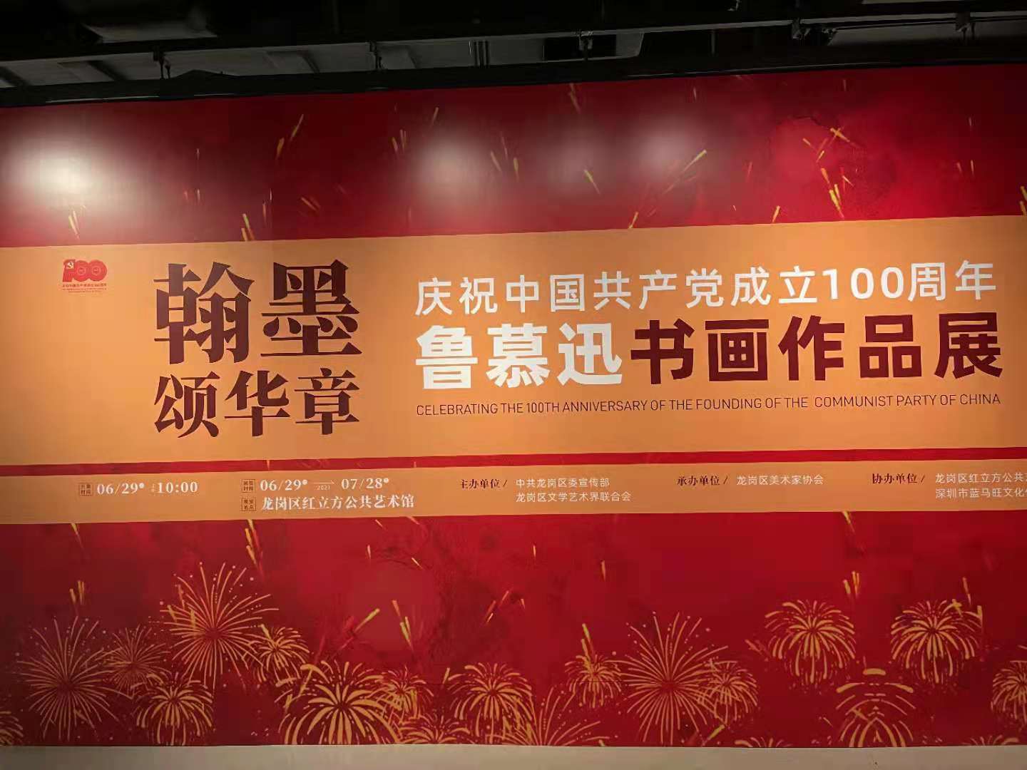 為慶祝中國共產黨成立100周年,謳歌建黨百年的豐功偉績,由中共深圳市龍崗區委宣傳部、龍崗區文學藝術界聯合會主辦,龍崗區美術家協會承辦的「翰墨頌華章——慶祝中國共產黨成立100周年魯慕迅書畫作品展」於2021年6月29日,在龍崗區紅立方公共藝術館啟幕。本次展覽共展出魯慕迅先生創作的百幅書畫作品,以表九十三歲高齡共產黨員對建黨一百周年和祖國繁榮富強的美好祝願。展覽將展至7月28日,免費向市民開放。