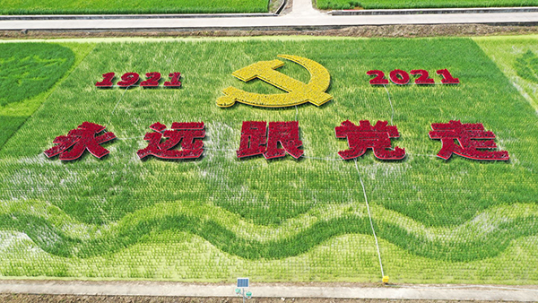 大鵬新區是深圳的「生態特區」,當前正加快推進深圳國際生物谷和國際食品谷「雙谷」建設。在建黨百年即將到來之際,大鵬新區以大地為紙,稻穗為筆,在中國農業科學院深圳綜合試驗基地內「描繪畫卷」,把綠水青山襯托得格外明亮。稻田畫綠色為底,加上百年元素,「永遠跟黨走」的字樣格外醒目,整幅作品在陽光里熠熠生輝,生動勾勒出對中國共產黨的深情祝福。