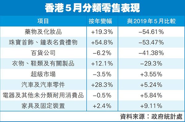 香港零售業看似持續「好轉」,若與2019年5月相比,上月零售業臨時總銷貨值仍相距25.89%。其中,與「自由行」相關的奢侈品銷售方面,雖然5月份銷售按年增長19.3%,但與2019年5月相比,仍急跌54.61%;至於珠寶首飾、鐘表及名貴禮物,雖然今年5月銷售按年增長54.8%,但與2019年5月相比,仍大幅減少53.47%。
