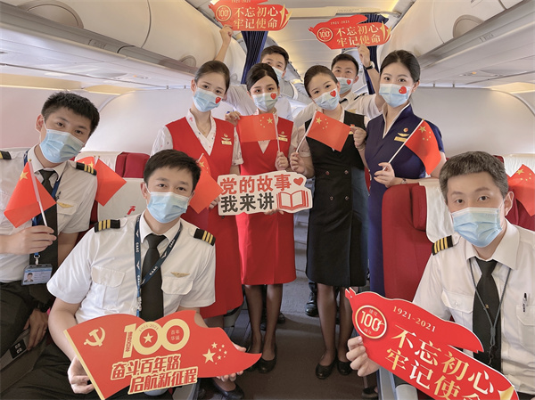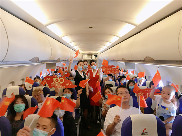 2021年中國共產黨迎來百年華誕,百年征程波瀾壯闊,百年初心歷久彌堅,為慶祝建黨一百周年,深航客艙服務部聯合哈爾濱、南寧、泉州、南京等分公司客艙服務部齊心策劃舉辦了機上「萬米藍天講黨史,紅色文化進客艙」機上主題航班活動。活動選擇了北京、南昌、西安、南京、宜賓等紅色航線,當天執行活動航班的乘務員均為中國共產黨員,他們以飽滿的精神面貌和熱情洋溢的服務態度迎接着每一位旅客,並為旅客發放了國旗、黨旗,在萬米高空與旅客共同慶祝黨的百年華誕。
