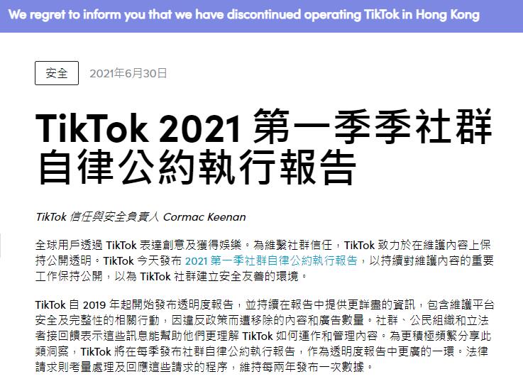 TikTok6月30日在官網發布2021一季度社群自律公約執行報告稱,一季度約1100萬個帳戶因違反TikTok社群自律公約或服務條款而被移除,其中約700萬個帳戶因疑似屬於未滿13歲用戶而被移除;共有約6200萬支視頻因違反TikTok社群自律公約或服務條款而被移除。